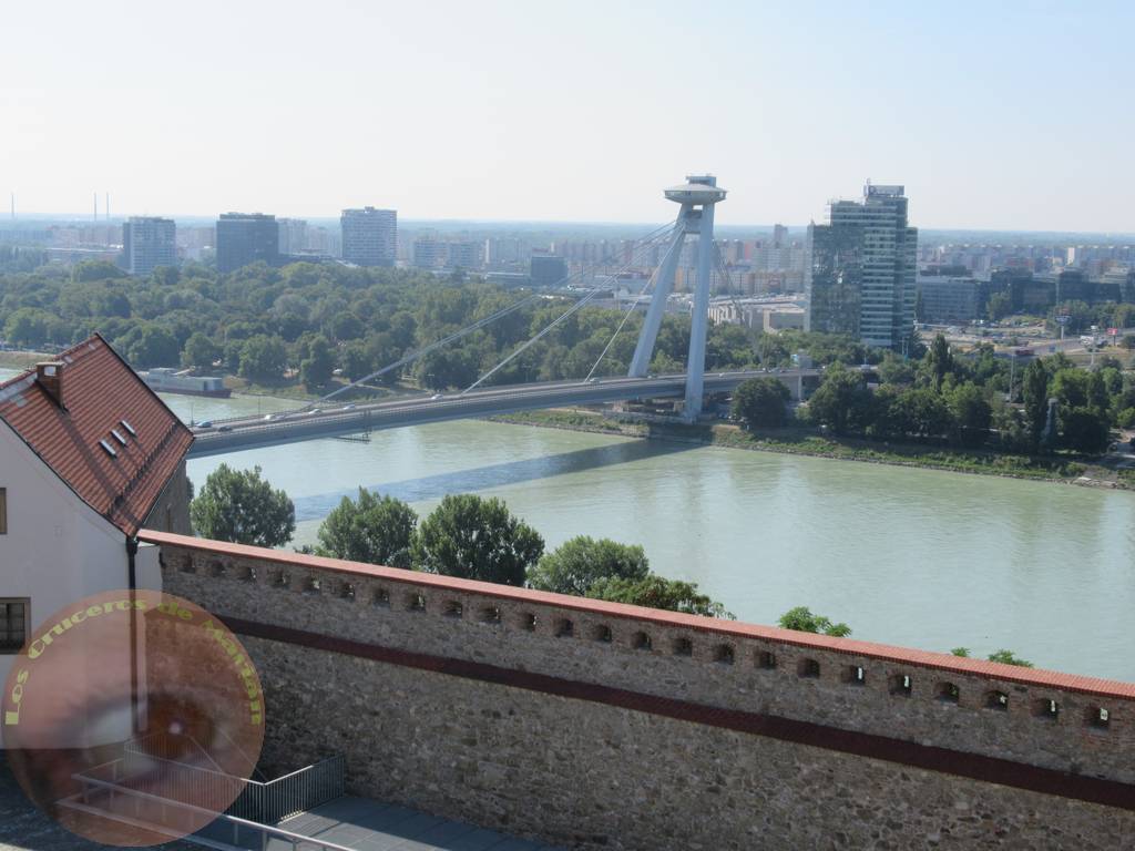A pocos metros de la salida del puerto, junto a la Plaza Hviezdoslav, nos estaba esperando el autocar, al que subimos y en poco menos de media hora nos dejó junto al Castillo de Bratislava. Durante ese tiempo recorrimos parte de la ciudad y algunas zonas residenciales de la misma,  amenizados por las explicaciones de nuestra guía. El autobús nos dejó junto al castillo, para realizar la visita exterior del mismo a pie. Allí estuvimos unos 45 minutos, prácticamente el tiempo justo para dar una vuelta alrededor del edificio y sacarle unas fotos, así como de las espectaculares vistas de la ciudad que teníamos desde allí.