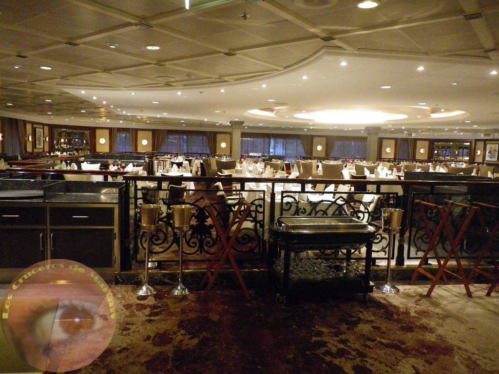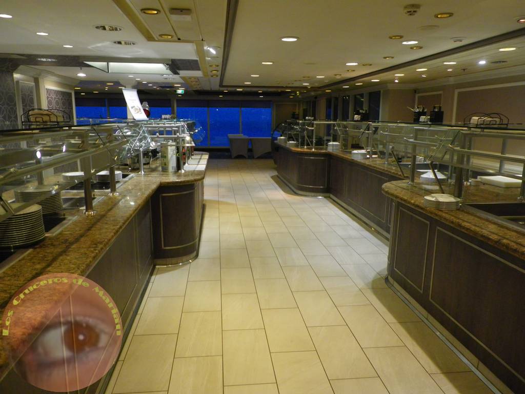 Ya en la cubierta 5, en la zona de popa se encuentra el restaurante principal Discoveries Restaurant. Nuestra reserva incluía el paquete de bebidas, camarote con balcón y turno libre para cenar en el restaurante. Dependiendo de la hora, algunas veces teníamos que esperar un poco a que nos asignaran mesa, pero por lo general el proceso era rápido y en pocos minutos estábamos sentados en nuestra mesa. Eso sí, al tener turno libre la asignación de mesas era aleatoria y en ninguna ocasión coincidimos con los mismos asistentes de mesa, quienes en general tenían un trato formal, en mi opinión con excesiva seriedad, a excepción de una chica que nos atendió con suma amabilidad y agrado y que nos encontramos en varias ocasiones en el buffet. Con respecto a la decoración del restaurante, predominaban la madera y los tonos de las paredes y moqueta, al igual que en resto del barco, en colores marrones claros y oscuros, ofreciendo a los comensales un ambiente clásico.