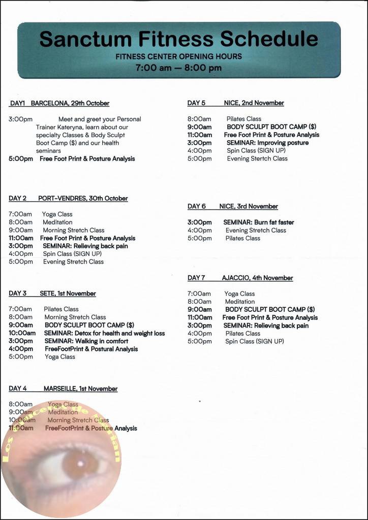 En la proa están los servicios dedicados al bienestar y belleza del cuerpo, el Fitness Center, gimnasio con bastantes máquinas para mantenerte en forma y compensar un poco la ingesta masiva de calorías con que nos homenajeamos durante el crucero. Allí diariamente se ofrecen a los pasajeros clases gratuitas de yoga o pilates.