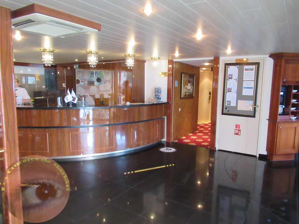 Comenzando mi análisis del barco, empezaré por el Puente Promenade donde nada más embarcar, en la zona central, nos encontramos con un lobby y la recepción del barco, así como una biblioteca y una sala de estar con una chimenea, todo ello decorado con sillones de piel y mobiliario de madera oscura. En el centro hay una gran escalera de caracol que comunica esta cubierta con el Puente Principal. Hacia la proa se encuentra el Salón Bar, amplia área cuya decoración está realizada con mesas también de madera oscura y sillones/sofás en tonos grises azulados, así como moqueta color granate que, junto con la buena luminosidad del salón, rodeado de ventanales, hace que sea el lugar ideal para disfrutar de los paisajes durante la navegación.