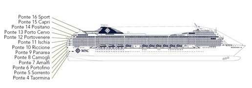 Tras desplazarme hasta el Puerto de Barcelona, escala inicial de este crucero, observo a primera vista que por su tamaño 95.128 toneladas, pareciera que iba a encontrarme con unos interiores espectaculares tal y como suele ser habitual en buques de estas dimensiones, sin embargo una vez a bordo compruebo que su estilo es moderno y elegante sin llegar a ser ostentoso o espectacular por dentro. Con una capacidad de 3.223 huéspedes y una tripulación de 1.038 miembros, 294 metros de eslora y 32 de manga; este buque pertenece a la clase Musica fue construido por STX Europe de Saint-Nazaire en Francia e inaugurado en 2009.